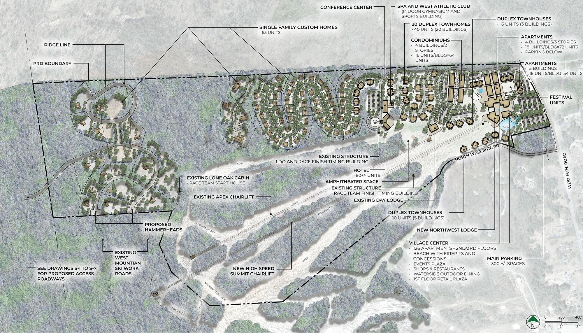 The ski area is now poised to become a destination resort. Studio A was retained to develop a Master Plan for the base area of North West Mountain. Planning includes a retail/hospitality village at the base of a new ski lift, condominium housing, townhouses, single family lots, new lodge with outdoor amenities (fire pit, hot tubs, lounging area), and a boutique hotel with wedding venue and exercise/spa facilities.